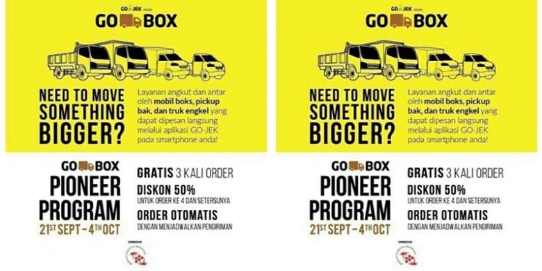 Dalam foto dengan latar warna kuning tersebut, logo Go Box tertera di atas dengan ikon gambar truk berwarna coklat. "Need to Move Something Bigger?" demikian teaser yang dipakai oleh Go-Box.